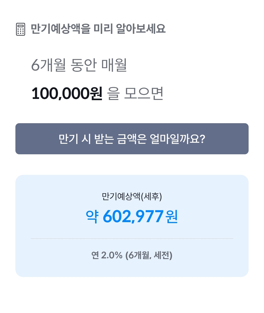 10만원씩 6개월 가입시 이자계산하면 세전 3,507원/ 세후 고작 2,977원이 전부입니다. ㅎㅎ