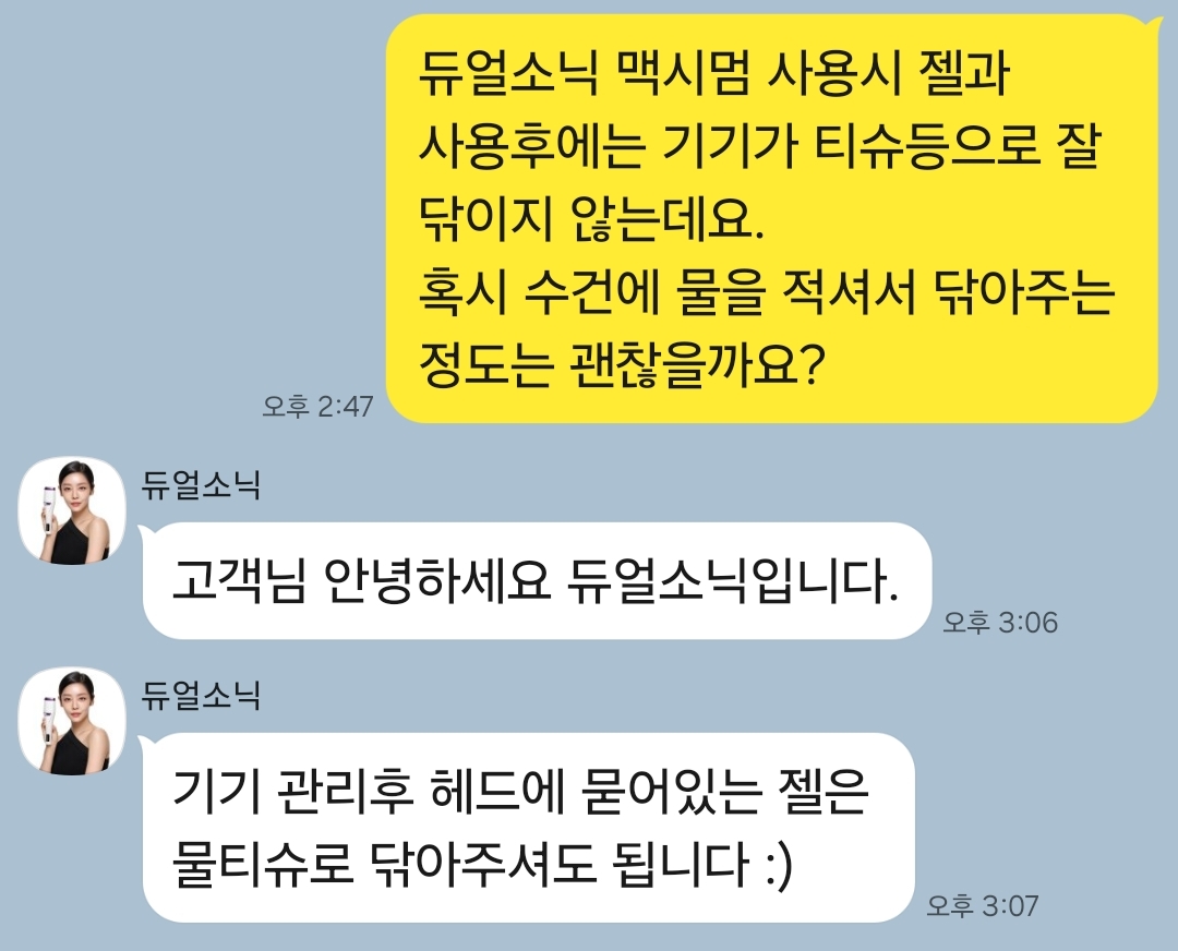 기기가 깨끗이 안닦이고 지저분하게 사용하면 오히려 피부에 안좋을 것 같아서 수건을 적셔서 닦아주고, 다음날 고객센터에 관련 문의를 해보았습니다.