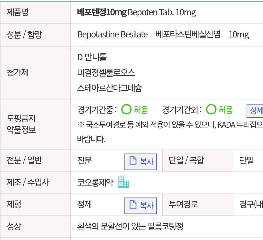 --> 다년성 알레르기성 비염, 만성 두드러기, 피부질환에 수반된 소양증(습진, 피부염, 피부소양증, 양진) --> 통상, 성인에게는 베포타스틴베실산염으로서 1회 10mg을 1일 2회 경구투여